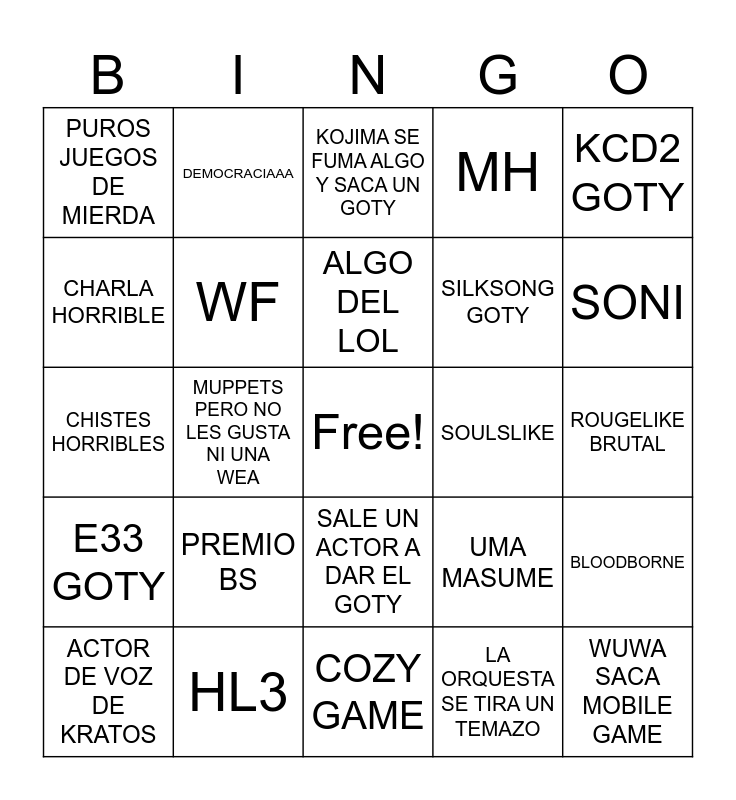 This bingo card has a free space and 24 words: PREMIO BS, HL3, ALGO DEL LOL, ACTOR DE VOZ DE KRATOS, KCD2 GOTY, PUROS JUEGOS DE MIERDA, CHARLA HORRIBLE, DEMOCRACIAAA, SOULSLIKE, SALE UN ACTOR A DAR EL GOTY, SILKSONG GOTY, CHISTES HORRIBLES, UMA MASUME, BLOODBORNE, WF, LA ORQUESTA SE TIRA UN TEMAZO, ROUGELIKE BRUTAL, KOJIMA SE FUMA ALGO Y SACA UN GOTY, SONI, MUPPETS PERO NO LES GUSTA NI UNA WEA, WUWA SACA MOBILE GAME, E33 GOTY, MH and COZY GAME.