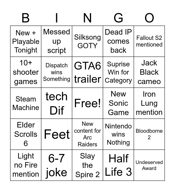This bingo card has a free space and 24 words: Feet, 6-7 joke, GTA6 trailer, Light no Fire mention, Fallout S2 mentioned, New + Playable Tonight, 10+ shooter games, Messed up script, New Sonic Game, New content for Arc Raiders, Suprise Win for Category, Steam Machine, Nintendo wins Nothing, Bloodborne 2, Dispatch wins Something, Half Life 3, Iron Lung mention, Silksong GOTY, Jack Black cameo, tech Dif, Undeserved Award, Elder Scrolls 6, Dead IP comes back and Slay the Spire 2.