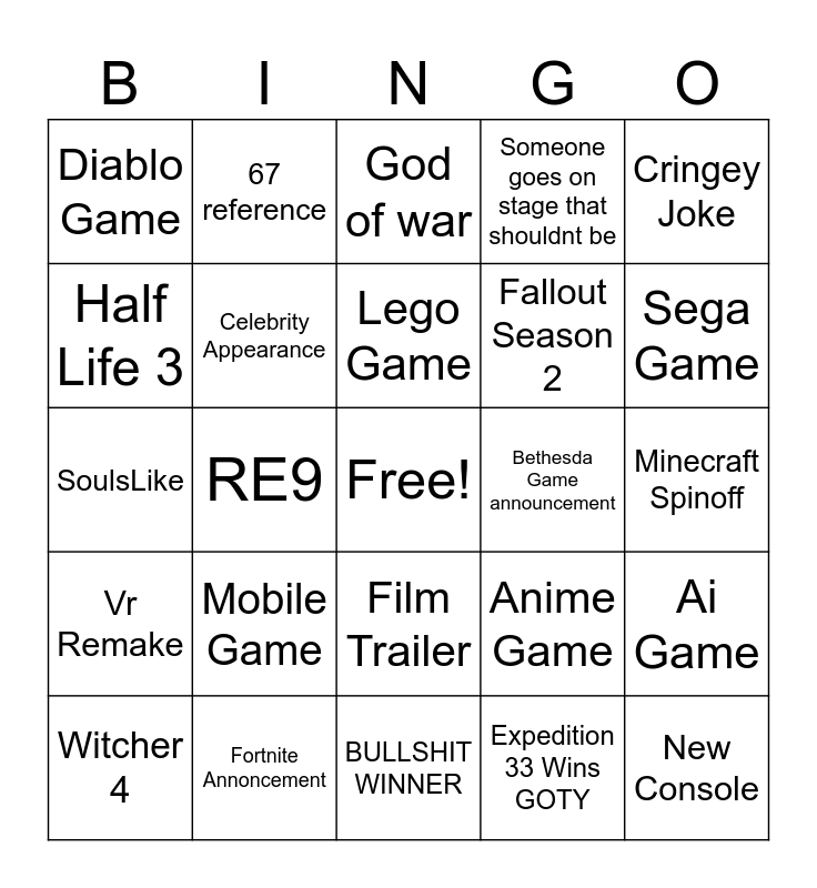 This bingo card has a free space and 24 words: Mobile Game, Fortnite Annoncement, Lego Game, Witcher 4, Cringey Joke, Diablo Game, Half Life 3, 67 reference, Bethesda Game announcement, Film Trailer, Fallout Season 2, SoulsLike, Anime Game, Ai Game, Celebrity Appearance, Expedition 33 Wins GOTY, Minecraft Spinoff, God of war, Sega Game, RE9, New Console, Vr Remake, Someone goes on stage that shouldnt be and BULLSHIT WINNER.