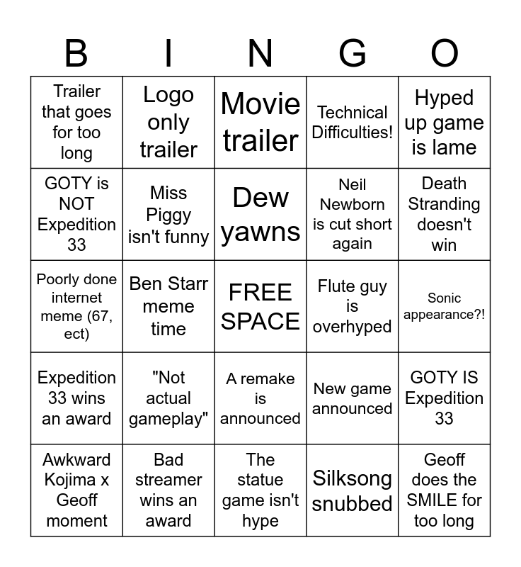 This bingo card has a free space and 33 words: "World Premiere", Geoff gets emotional, Ben Starr meme time, Random celebrity, Expedition 33 wins an award, Miss Piggy isn't funny, Hyped up game is lame, Awkward Kojima x Geoff moment, Logo only trailer, Another shooter, Dew yawns, Movie trailer, Todd Howard is a funny little guy, A joke falls completely flat, Flute guy is overhyped, Death Stranding doesn't win, Bad streamer wins an award, Poorly done internet meme (67, ect), "Not actual gameplay", New game announced, A remake is announced, Dew gets excited, Trailer that goes for too long, Sonic appearance?!, The statue game isn't hype, Geoff does the SMILE for too long, Technical Difficulties!, Neil Newborn is cut short again, GOTY is NOT Expedition 33, GOTY IS Expedition 33, Crazy/Unexpected reveal, Silksong snubbed and Playstation does a dumb announcement (PS7).