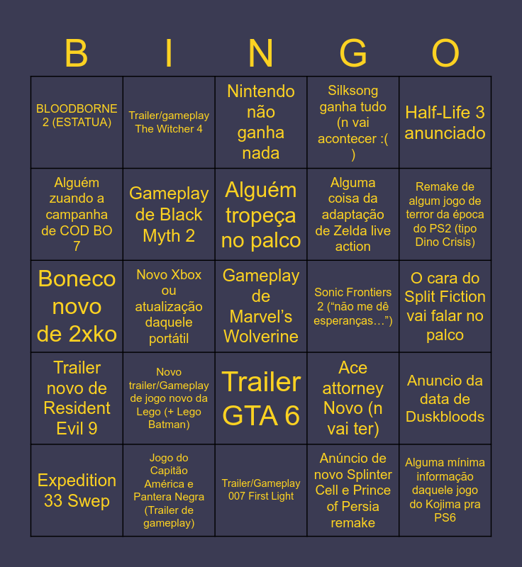 This bingo card has 25 words: Novo trailer/Gameplay de jogo novo da Lego (+ Lego Batman), Trailer/Gameplay 007 First Light, Alguém tropeça no palco, Expedition 33 Swep, Half-Life 3 anunciado, BLOODBORNE 2 (ESTATUA), Alguém zuando a campanha de COD BO 7, Trailer/gameplay The Witcher 4, Sonic Frontiers 2 (“não me dê esperanças…”), Trailer GTA 6, Alguma coisa da adaptação de Zelda live action, Boneco novo de 2xko, Ace attorney Novo (n vai ter), Anuncio da data de Duskbloods, Gameplay de Black Myth 2, Alguma mínima informação daquele jogo do Kojima pra PS6, O cara do Split Fiction vai falar no palco, Nintendo não ganha nada, Remake de algum jogo de terror da época do PS2 (tipo Dino Crisis), Novo Xbox ou atualização daquele portátil, Gameplay de Marvel’s Wolverine, Jogo do Capitão América e Pantera Negra (Trailer de gameplay), Trailer novo de Resident Evil 9, Silksong ganha tudo (n vai acontecer :( ) and Anúncio de novo Splinter Cell e Prince of Persia remake.