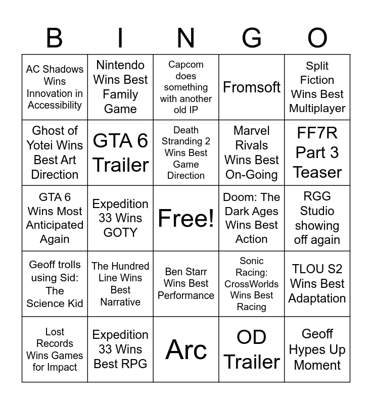 This bingo card has a free space and 24 words: The Hundred Line Wins Best Narrative, Expedition 33 Wins Best RPG, Death Stranding 2 Wins Best Game Direction, Lost Records Wins Games for Impact, Split Fiction Wins Best Multiplayer, AC Shadows Wins Innovation in Accessibility, Ghost of Yotei Wins Best Art Direction, Nintendo Wins Best Family Game, Doom: The Dark Ages Wins Best Action, Ben Starr Wins Best Performance, Marvel Rivals Wins Best On-Going, GTA 6 Wins Most Anticipated Again, Sonic Racing: CrossWorlds Wins Best Racing, TLOU S2 Wins Best Adaptation, GTA 6 Trailer, OD Trailer, RGG Studio showing off again, Capcom does something with another old IP, FF7R Part 3 Teaser, Expedition 33 Wins GOTY, Geoff Hypes Up Moment, Geoff trolls using Sid: The Science Kid, Fromsoft and Arc.