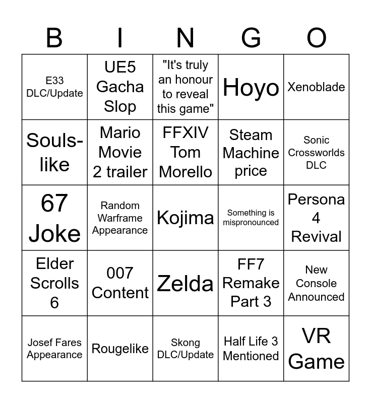 This bingo card has a free space and 24 words: 007 Content, Rougelike, FFXIV Tom Morello, Josef Fares Appearance, Xenoblade, E33 DLC/Update, Souls-like, UE5 Gacha Slop, Something is mispronounced, Zelda, Steam Machine price, 67 Joke, FF7 Remake Part 3, New Console Announced, Mario Movie 2 trailer, Half Life 3 Mentioned, Persona 4 Revival, "It's truly an honour to reveal this game", Sonic Crossworlds DLC, Random Warframe Appearance, VR Game, Elder Scrolls 6, Hoyo and Skong DLC/Update.