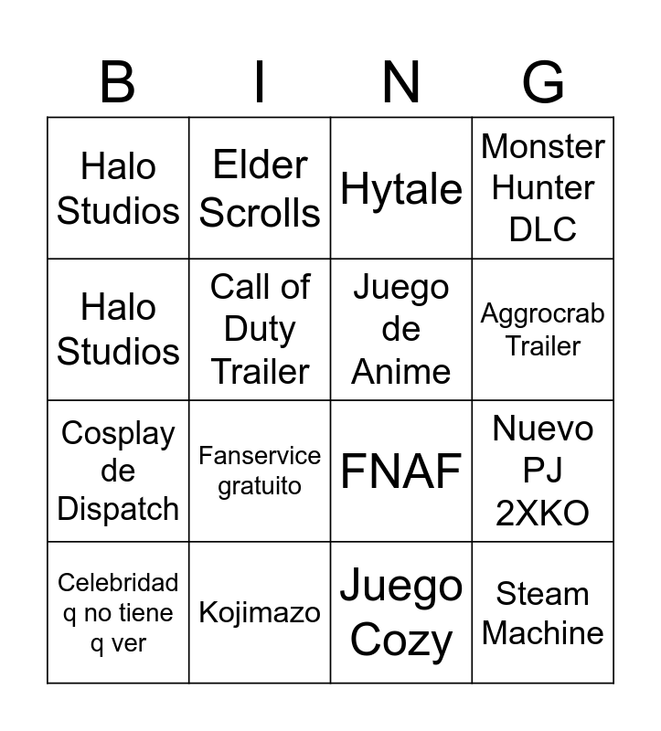 This bingo card has 16 words: Kojimazo, Nuevo PJ 2XKO, Hytale, Halo Studios, Cosplay de Dispatch, Elder Scrolls, FNAF, Juego Cozy, Halo Studios, Call of Duty Trailer, Celebridad q no tiene q ver, Monster Hunter DLC, Fanservice gratuito, Aggrocrab Trailer, Juego de Anime and Steam Machine.