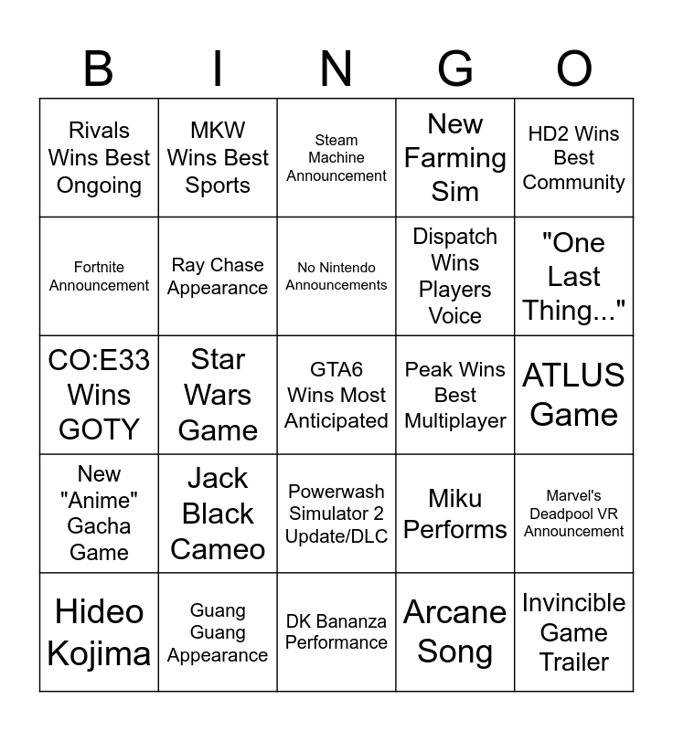 This bingo card has a free space and 24 words: Jack Black Cameo, Guang Guang Appearance, No Nintendo Announcements, Hideo Kojima, HD2 Wins Best Community, Rivals Wins Best Ongoing, Fortnite Announcement, MKW Wins Best Sports, Peak Wins Best Multiplayer, Powerwash Simulator 2 Update/DLC, Dispatch Wins Players Voice, CO:E33 Wins GOTY, Miku Performs, Marvel's Deadpool VR Announcement, Ray Chase Appearance, Arcane Song, ATLUS Game, Steam Machine Announcement, "One Last Thing...", Star Wars Game, Invincible Game Trailer, New "Anime" Gacha Game, New Farming Sim and DK Bananza Performance.