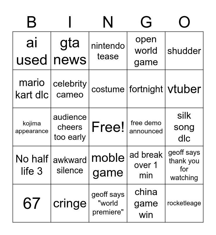 This bingo card has a free space and 24 words: 67, awkward silence, costume, china game win, shudder, ai used, gta news, nintendo tease, free demo announced, silk song dlc, kojima appearance, celebrity cameo, ad break over 1 min, geoff says thank you for watching, mario kart dlc, cringe, geoff says "world premiere", open world game, vtuber, No half life 3, audience cheers too early, moble game, fortnight and rocketleage.