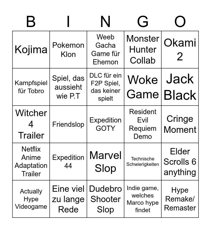This bingo card has a free space and 24 words: Expedition 44, Eine viel zu lange Rede, DLC für ein F2P Spiel, das keiner spielt, Actually Hype Videogame, Okami 2, Kojima, Kampfspiel für Tobro, Pokemon Klon, Resident Evil Requiem Demo, Marvel Slop, Woke Game, Witcher 4 Trailer, Technische Schwierigkeiten, Elder Scrolls 6 anything, Spiel, das aussieht wie P.T, Indie game, welches Marco hype findet, Cringe Moment, Weeb Gacha Game für Ehemon, Jack Black, Friendslop, Hype Remake/ Remaster, Netflix Anime Adaptation Trailer, Monster Hunter Collab and Dudebro Shooter Slop.