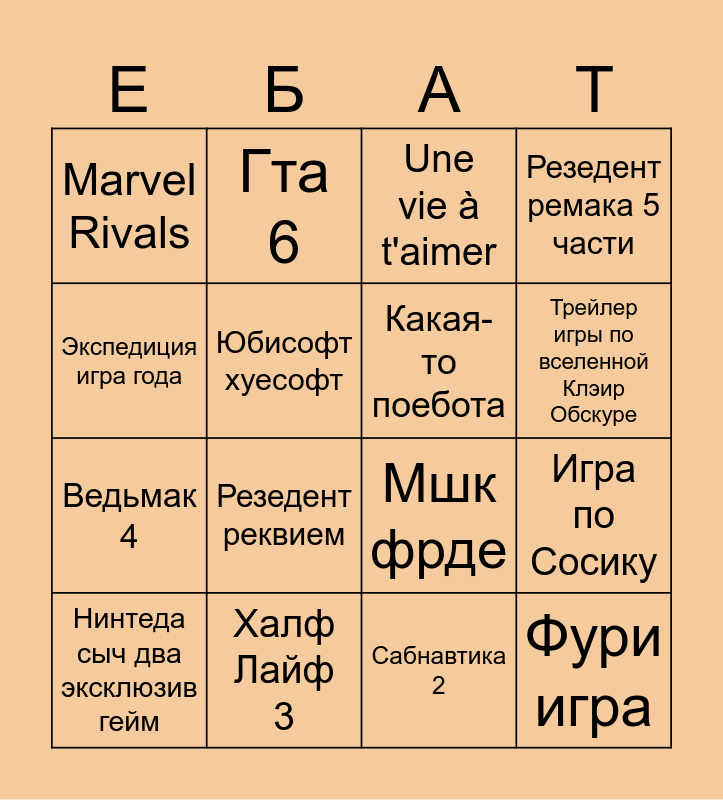 This bingo card has 16 words: Халф Лайф 3, Игра по Сосику, Une vie à t'aimer, Marvel Rivals, Ведьмак 4, Гта 6, Мшк фрде, Сабнавтика 2, Экспедиция игра года, Юбисофт хуесофт, Нинтеда сыч два эксклюзив гейм, Резедент ремака 5 части, Резедент реквием, Трейлер игры по вселенной Клэир Обскуре, Какая-то поебота and Фури игра.