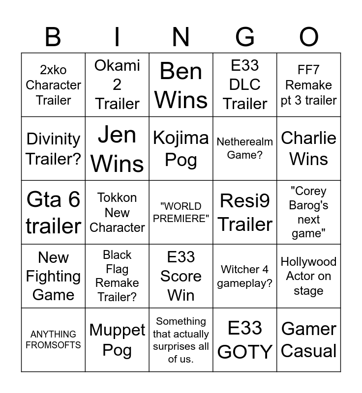 This bingo card has a free space and 24 words: Black Flag Remake Trailer?, Muppet Pog, Kojima Pog, ANYTHING FROMSOFTS, FF7 Remake pt 3 trailer, 2xko Character Trailer, Divinity Trailer?, Okami 2 Trailer, Resi9 Trailer, E33 Score Win, Netherealm Game?, Gta 6 trailer, Witcher 4 gameplay?, Hollywood Actor on stage, Jen Wins, E33 GOTY, "Corey Barog's next game", Ben Wins, Charlie Wins, Tokkon New Character, Gamer Casual, New Fighting Game, E33 DLC Trailer and Something that actually surprises all of us..