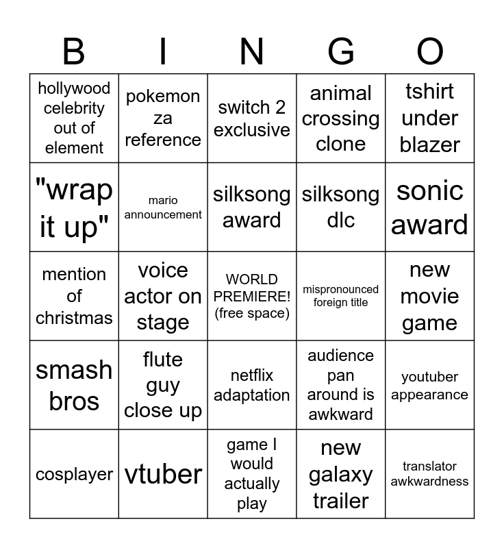 This bingo card has a free space and 24 words: flute guy close up, vtuber, silksong award, cosplayer, tshirt under blazer, hollywood celebrity out of element, "wrap it up", pokemon za reference, mispronounced foreign title, netflix adaptation, silksong dlc, mention of christmas, audience pan around is awkward, youtuber appearance, mario announcement, new galaxy trailer, new movie game, switch 2 exclusive, sonic award, voice actor on stage, translator awkwardness, smash bros, animal crossing clone and game I would actually play.
