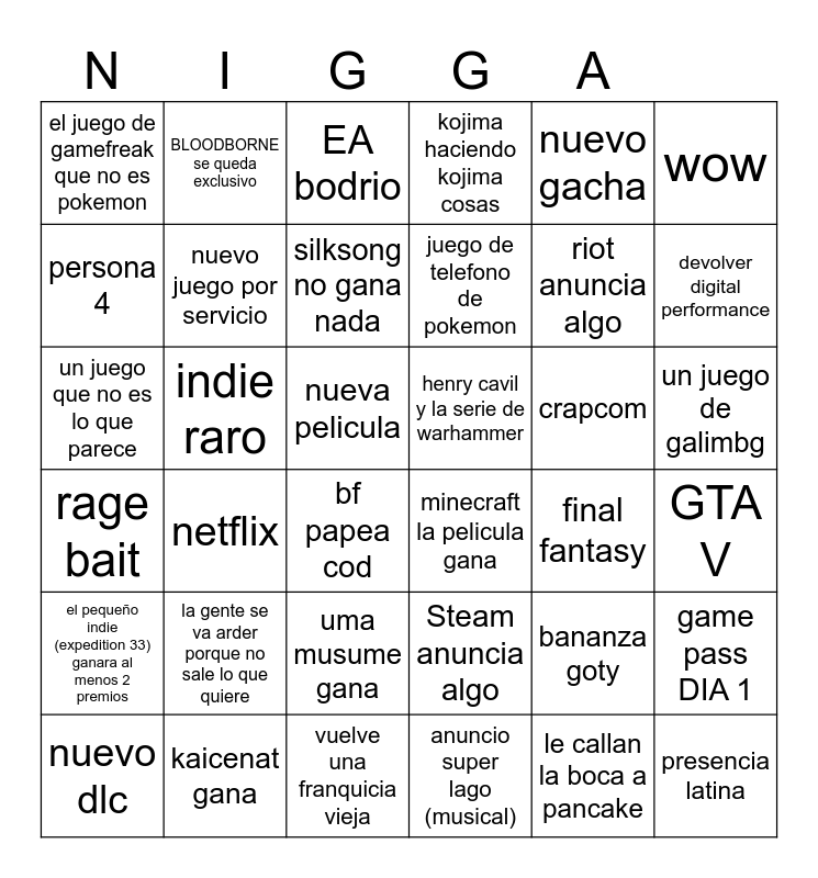 This bingo card has 36 words: Steam anuncia algo, uma musume gana, anuncio super lago (musical), persona 4, rage bait, henry cavil y la serie de warhammer, nuevo juego por servicio, vuelve una franquicia vieja, nuevo gacha, bananza goty, devolver digital performance, kojima haciendo kojima cosas, game pass DIA 1, indie raro, juego de telefono de pokemon, el juego de gamefreak que no es pokemon, el pequeño indie (expedition 33) ganara al menos 2 premios, crapcom, un juego que no es lo que parece, EA bodrio, nueva pelicula, netflix, minecraft la pelicula gana, bf papea cod, final fantasy, BLOODBORNE se queda exclusivo, riot anuncia algo, kaicenat gana, silksong no gana nada, wow, presencia latina, nuevo dlc, GTA V, un juego de galimbg, la gente se va arder porque no sale lo que quiere and le callan la boca a pancake.