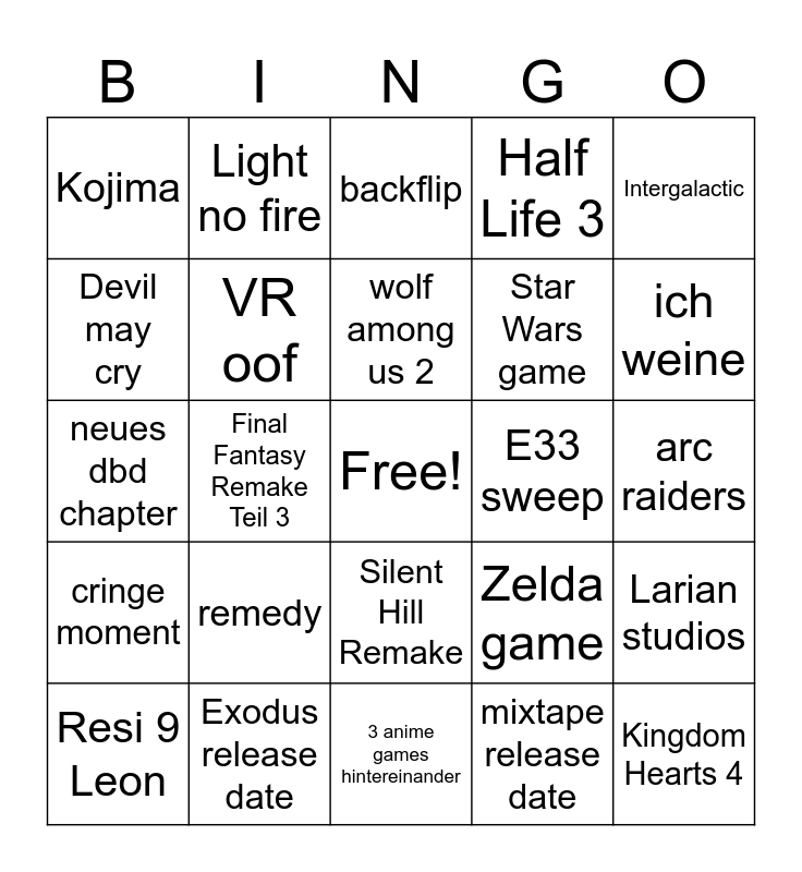 This bingo card has a free space and 24 words: remedy, Exodus release date, wolf among us 2, Resi 9 Leon, Intergalactic, Kojima, Devil may cry, Light no fire, E33 sweep, Silent Hill Remake, Star Wars game, neues dbd chapter, Zelda game, Larian studios, VR oof, mixtape release date, arc raiders, backflip, ich weine, Final Fantasy Remake Teil 3, Kingdom Hearts 4, cringe moment, Half Life 3 and 3 anime games hintereinander.