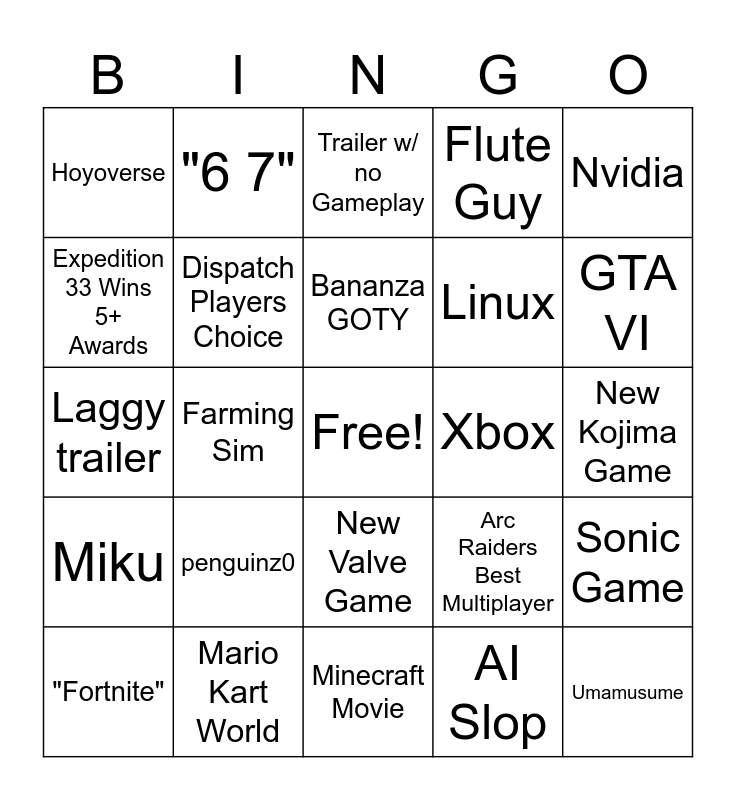 This bingo card has a free space and 24 words: penguinz0, Mario Kart World, Bananza GOTY, "Fortnite", Nvidia, Hoyoverse, Expedition 33 Wins 5+ Awards, "6 7", Xbox, New Valve Game, Linux, Laggy trailer, Arc Raiders Best Multiplayer, Sonic Game, Dispatch Players Choice, AI Slop, New Kojima Game, Trailer w/ no Gameplay, GTA VI, Farming Sim, Umamusume, Miku, Flute Guy and Minecraft Movie.