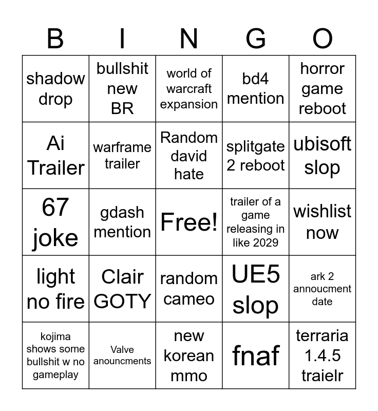 This bingo card has a free space and 24 words: Clair GOTY, Valve anouncments, Random david hate, kojima shows some bullshit w no gameplay, horror game reboot, shadow drop, Ai Trailer, bullshit new BR, trailer of a game releasing in like 2029, random cameo, splitgate 2 reboot, 67 joke, UE5 slop, ark 2 annoucment date, warframe trailer, fnaf, wishlist now, world of warcraft expansion, ubisoft slop, gdash mention, terraria 1.4.5 traielr, light no fire, bd4 mention and new korean mmo.