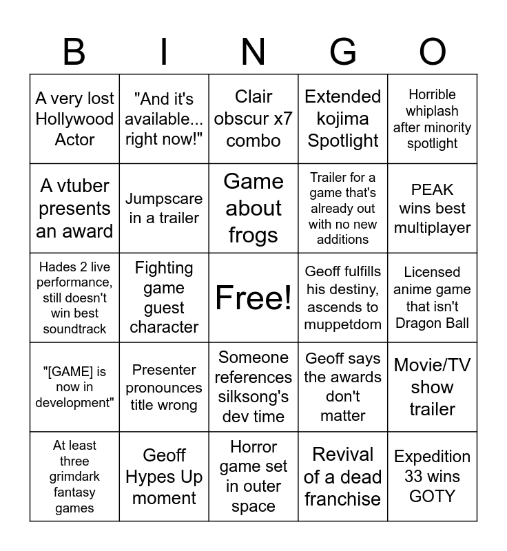 This bingo card has a free space and 24 words: Presenter pronounces title wrong, Geoff Hypes Up moment, Game about frogs, At least three grimdark fantasy games, Horrible whiplash after minority spotlight, A very lost Hollywood Actor, A vtuber presents an award, "And it's available... right now!", Geoff fulfills his destiny, ascends to muppetdom, Someone references silksong's dev time, Trailer for a game that's already out with no new additions, Hades 2 live performance, still doesn't win best soundtrack, Geoff says the awards don't matter, Movie/TV show trailer, Jumpscare in a trailer, Revival of a dead franchise, Licensed anime game that isn't Dragon Ball, Clair obscur x7 combo, PEAK wins best multiplayer, Fighting game guest character, Expedition 33 wins GOTY, "[GAME] is now in development", Extended kojima Spotlight and Horror game set in outer space.
