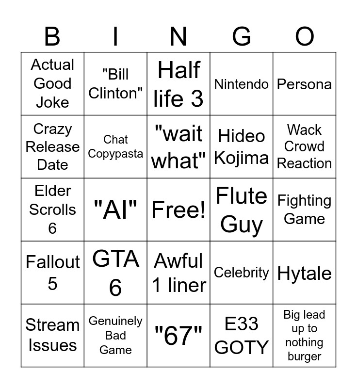 This bingo card has a free space and 24 words: GTA 6, Genuinely Bad Game, "wait what", Stream Issues, Persona, Actual Good Joke, Crazy Release Date, "Bill Clinton", Flute Guy, Awful 1 liner, Hideo Kojima, Elder Scrolls 6, Celebrity, Hytale, Chat Copypasta, E33 GOTY, Fighting Game, Half life 3, Wack Crowd Reaction, "AI", Big lead up to nothing burger, Fallout 5, Nintendo and "67".