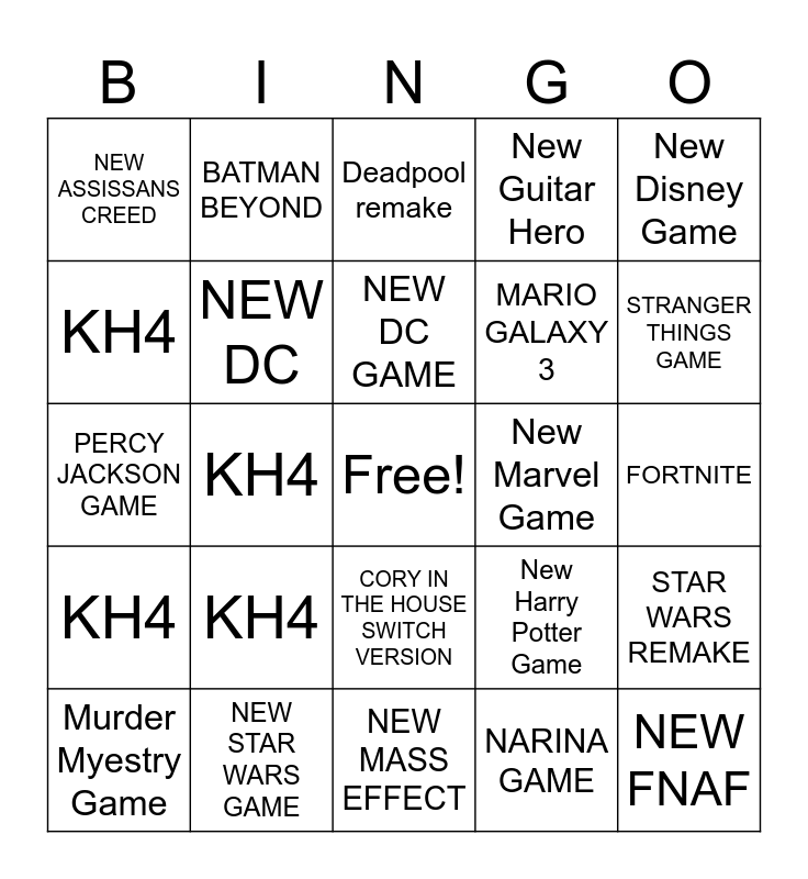 This bingo card has a free space and 24 words: KH4, NEW STAR WARS GAME, NEW DC GAME, Murder Myestry Game, New Disney Game, NEW ASSISSANS CREED, KH4, BATMAN BEYOND, New Marvel Game, CORY IN THE HOUSE SWITCH VERSION, MARIO GALAXY 3, PERCY JACKSON GAME, New Harry Potter Game, STAR WARS REMAKE, NEW DC, NARINA GAME, FORTNITE, Deadpool remake, STRANGER THINGS GAME, KH4, NEW FNAF, KH4, New Guitar Hero and NEW MASS EFFECT.