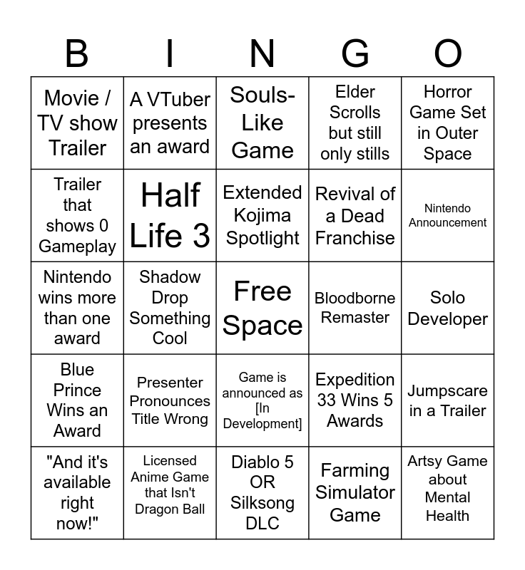 This bingo card has a free space and 24 words: Presenter Pronounces Title Wrong, Licensed Anime Game that Isn't Dragon Ball, Extended Kojima Spotlight, "And it's available right now!", Horror Game Set in Outer Space, Movie / TV show Trailer, Trailer that shows 0 Gameplay, A VTuber presents an award, Bloodborne Remaster, Game is announced as [In Development], Revival of a Dead Franchise, Nintendo wins more than one award, Expedition 33 Wins 5 Awards, Jumpscare in a Trailer, Half Life 3, Farming Simulator Game, Solo Developer, Souls-Like Game, Nintendo Announcement, Shadow Drop Something Cool, Artsy Game about Mental Health, Blue Prince Wins an Award, Elder Scrolls but still only stills and Diablo 5 OR Silksong DLC.