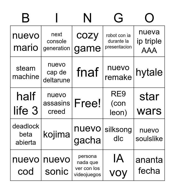 This bingo card has a free space and 24 words: kojima, nuevo sonic, fnaf, nuevo cod, nueva ip triple AAA, nuevo mario, steam machine, next console generation, RE9 (con leon), nuevo gacha, nuevo remake, half life 3, silksong dlc, nuevo soulslike, nuevo cap de deltarune, IA voy, star wars, cozy game, hytale, nuevo assasins creed, ananta fecha, deadlock beta abierta, robot con ia durante la presentacion and persona nada que ver con los videojuegos.