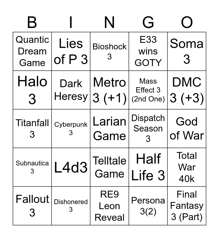 This bingo card has a free space and 24 words: L4d3, Dishonered 3, Metro 3 (+1), Fallout 3, Soma 3, Quantic Dream Game, Halo 3, Lies of P 3, Dispatch Season 3, Telltale Game, Mass Effect 3 (2nd One), Titanfall 3, Half Life 3, Total War 40k, Dark Heresy, Persona 3(2), God of War, Bioshock 3, DMC 3 (+3), Cyberpunk 3, Final Fantasy 3 (Part), Subnautica 3, E33 wins GOTY and RE9 Leon Reveal.
