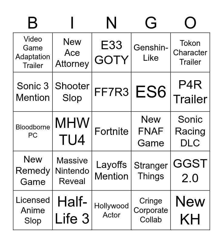This bingo card has a free space and 24 words: Massive Nintendo Reveal, Half-Life 3, FF7R3, Licensed Anime Slop, Tokon Character Trailer, Video Game Adaptation Trailer, Sonic 3 Mention, New Ace Attorney, New FNAF Game, Layoffs Mention, ES6, Bloodborne PC, Stranger Things, GGST 2.0, Shooter Slop, Cringe Corporate Collab, Sonic Racing DLC, E33 GOTY, P4R Trailer, MHW TU4, New KH, New Remedy Game, Genshin-Like and Hollywood Actor.