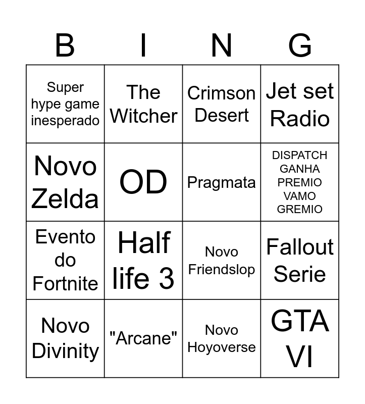 This bingo card has 16 words: "Arcane", Fallout Serie, Crimson Desert, Super hype game inesperado, Evento do Fortnite, The Witcher, Novo Friendslop, Novo Hoyoverse, Novo Zelda, OD, Novo Divinity, Jet set Radio, Half life 3, DISPATCH GANHA PREMIO VAMO GREMIO, Pragmata and GTA VI.