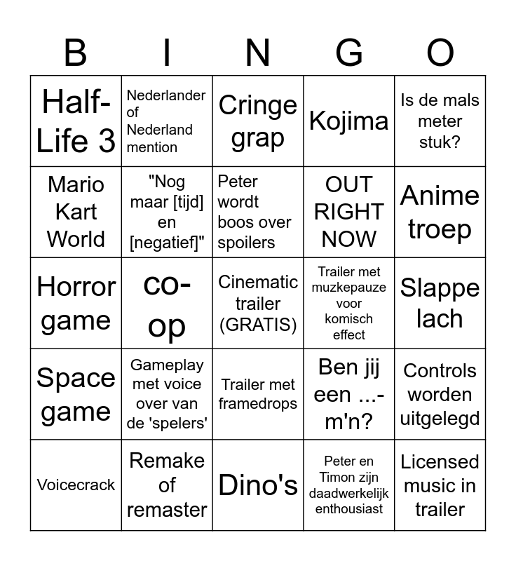 This bingo card has a free space and 24 words: Gameplay met voice over van de 'spelers', Remake of remaster, Peter wordt boos over spoilers, Voicecrack, Is de mals meter stuk?, Half-Life 3, Mario Kart World, Nederlander of Nederland mention, Trailer met muzkepauze voor komisch effect, Trailer met framedrops, OUT RIGHT NOW, Horror game, Ben jij een ...-m'n?, Controls worden uitgelegd, "Nog maar [tijd] en [negatief]", Peter en Timon zijn daadwerkelijk enthousiast, Slappe lach, Cringe grap, Anime troep, co-op, Licensed music in trailer, Space game, Kojima and Dino's.