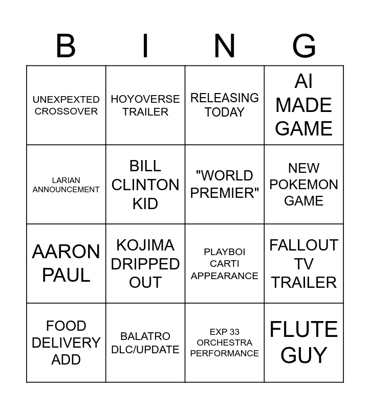 This bingo card has 16 words: BALATRO DLC/UPDATE, FALLOUT TV TRAILER, RELEASING TODAY, UNEXPEXTED CROSSOVER, AARON PAUL, HOYOVERSE TRAILER, PLAYBOI CARTI APPEARANCE, EXP 33 ORCHESTRA PERFORMANCE, LARIAN ANNOUNCEMENT, BILL CLINTON KID, FOOD DELIVERY ADD, AI MADE GAME, KOJIMA DRIPPED OUT, NEW POKEMON GAME, "WORLD PREMIER" and FLUTE GUY.
