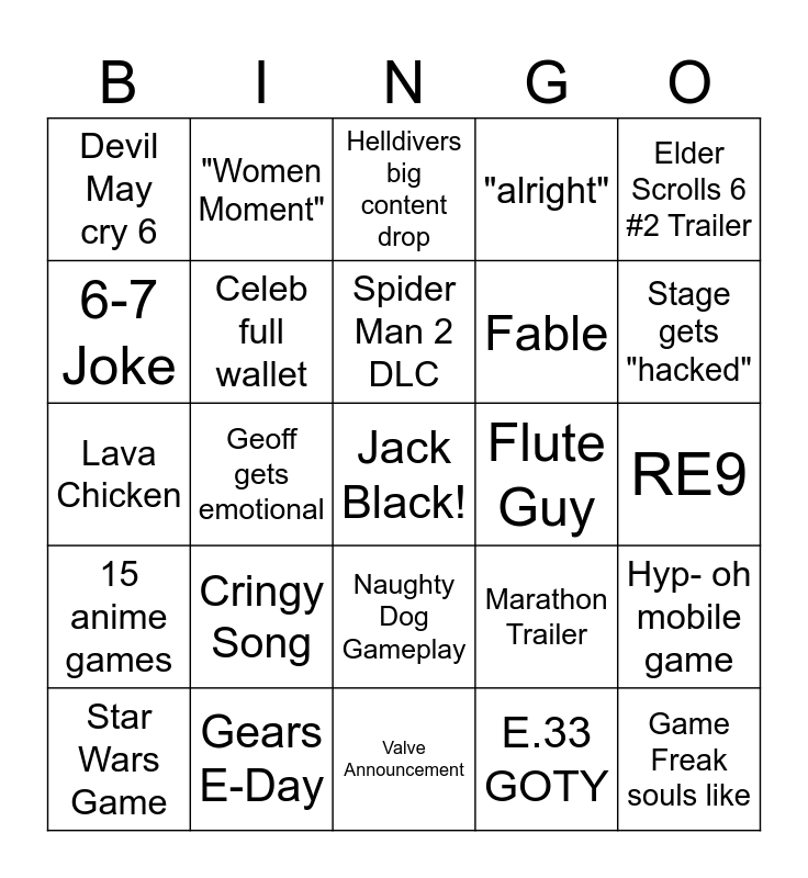 This bingo card has a free space and 24 words: Cringy Song, Gears E-Day, Spider Man 2 DLC, Star Wars Game, Elder Scrolls 6 #2 Trailer, Devil May cry 6, 6-7 Joke, "Women Moment", Flute Guy, Naughty Dog Gameplay, Fable, Lava Chicken, Marathon Trailer, Hyp- oh mobile game, Celeb full wallet, E.33 GOTY, RE9, Helldivers big content drop, Stage gets "hacked", Geoff gets emotional, Game Freak souls like, 15 anime games, "alright" and Valve Announcement.