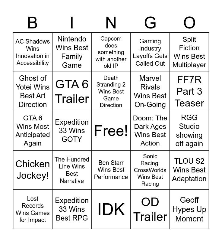 This bingo card has a free space and 24 words: The Hundred Line Wins Best Narrative, Expedition 33 Wins Best RPG, Death Stranding 2 Wins Best Game Direction, Lost Records Wins Games for Impact, Split Fiction Wins Best Multiplayer, AC Shadows Wins Innovation in Accessibility, Ghost of Yotei Wins Best Art Direction, Nintendo Wins Best Family Game, Doom: The Dark Ages Wins Best Action, Ben Starr Wins Best Performance, Marvel Rivals Wins Best On-Going, GTA 6 Wins Most Anticipated Again, Sonic Racing: CrossWorlds Wins Best Racing, TLOU S2 Wins Best Adaptation, GTA 6 Trailer, OD Trailer, RGG Studio showing off again, Capcom does something with another old IP, FF7R Part 3 Teaser, Expedition 33 Wins GOTY, Geoff Hypes Up Moment, Chicken Jockey!, Gaming Industry Layoffs Gets Called Out and IDK.