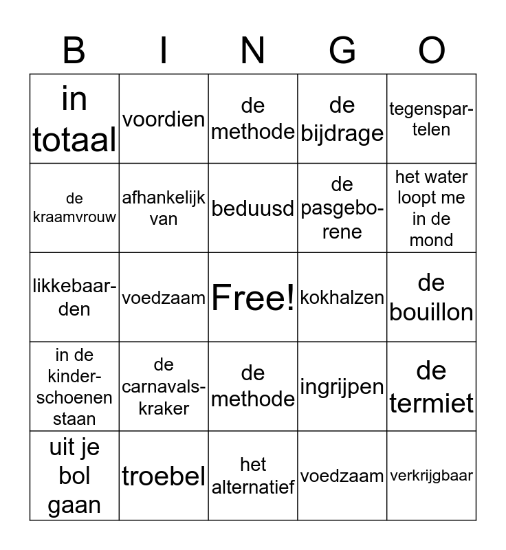 This bingo card has a free space and 24 words: de carnavals- kraker, troebel, beduusd, uit je bol gaan, tegenspar- telen, in totaal, de kraamvrouw, voordien, kokhalzen, de methode, de pasgebo- rene, likkebaar- den, ingrijpen, de termiet, afhankelijk van, voedzaam, de bouillon, de methode, het water loopt me in de mond, voedzaam, verkrijgbaar, in de kinder- schoenen staan, de bijdrage and het alternatief.