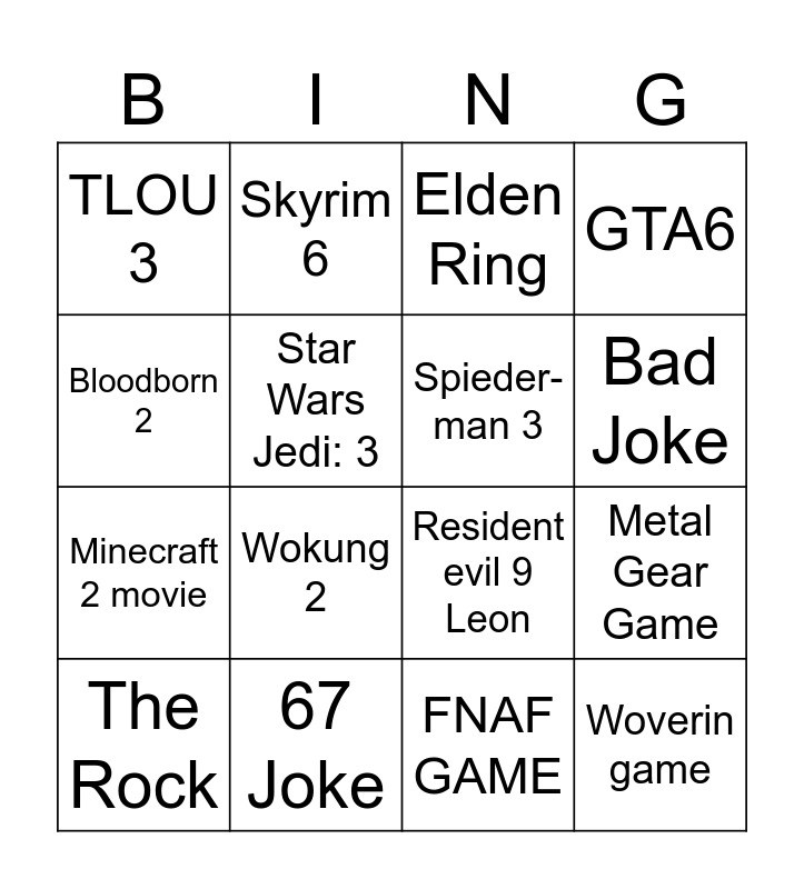 This bingo card has 16 words: The Rock, 67 Joke, Elden Ring, GTA6, Bloodborn 2, Skyrim 6, Resident evil 9 Leon, Metal Gear Game, TLOU 3, Star Wars Jedi: 3, FNAF GAME, Bad Joke, Minecraft 2 movie, Wokung 2, Spieder-man 3 and Woverin game.