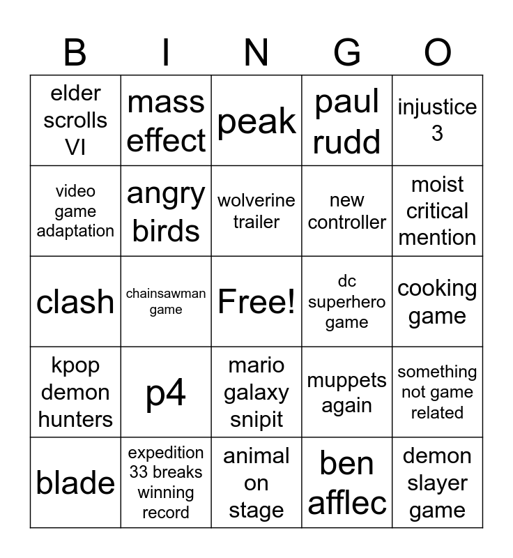 This bingo card has a free space and 24 words: p4, expedition 33 breaks winning record, wolverine trailer, blade, injustice 3, elder scrolls VI, video game adaptation, mass effect, dc superhero game, mario galaxy snipit, new controller, clash, muppets again, something not game related, angry birds, ben afflec, cooking game, peak, moist critical mention, chainsawman game, demon slayer game, kpop demon hunters, paul rudd and animal on stage.