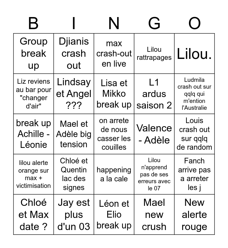 This bingo card has a free space and 24 words: Chloé et Quentin lac des signes, Jay est plus d'un 03, Lisa et Mikko break up, Chloé et Max date ?, Lilou., Group break up, Liz reviens au bar pour "changer d'air", Djianis crash out, Valence - Adèle, happening a la cale, L1 ardus saison 2, break up Achille - Léonie, Lilou n'apprend pas de ses erreurs avec le 07, Fanch arrive pas a arreter les j, Lindsay et Angel ???, Mael new crush, Louis crash out sur qqlq de random, max crash-out en live, Ludmila crash out sur qqlq qui m'ention l'Australie, Mael et Adèle big tension, New alerte rouge, lilou alerte orange sur max + victimisation, Lilou rattrapages and Léon et Elio break up.