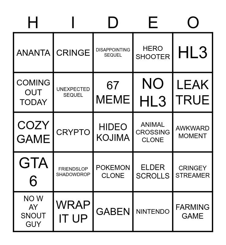 This bingo card has a free space and 24 words: NO WAY SNOUT GUY, FRIENDSLOP SHADOWDROP, 67 MEME, NINTENDO, HL3, ANANTA, CRINGE, DISAPPOINTING SEQUEL, ANIMAL CROSSING CLONE, AWKWARD MOMENT, COZY GAME, UNEXPECTED SEQUEL, ELDER SCROLLS, CRINGEY STREAMER, COMING OUT TODAY, WRAP IT UP, GABEN, HERO SHOOTER, LEAK TRUE, GTA 6, CRYPTO, POKEMON CLONE, NO HL3 and FARMING GAME.
