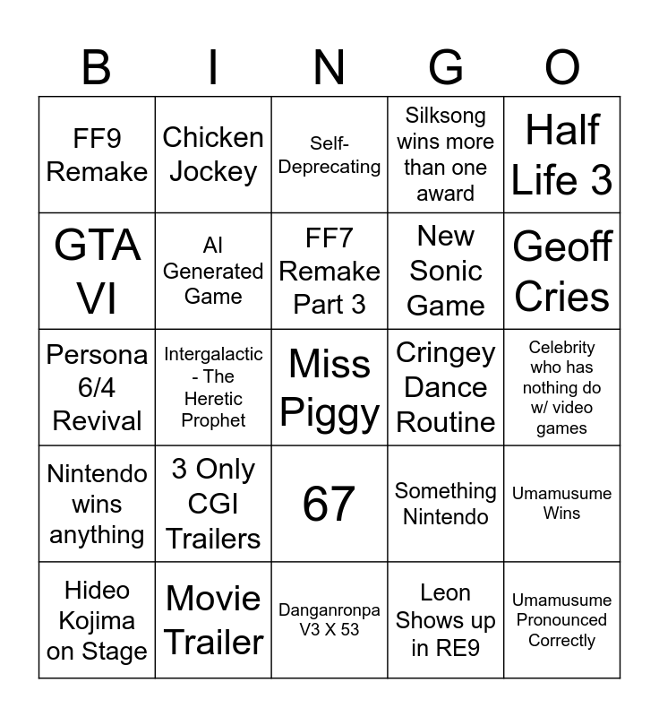 This bingo card has a free space and 24 words: 3 Only CGI Trailers, Movie Trailer, FF7 Remake Part 3, Hideo Kojima on Stage, Half Life 3, FF9 Remake, GTA VI, Chicken Jockey, Cringey Dance Routine, 67, New Sonic Game, Persona 6/4 Revival, Something Nintendo, Umamusume Wins, AI Generated Game, Leon Shows up in RE9, Celebrity who has nothing do w/ video games, Self-Deprecating, Geoff Cries, Intergalactic - The Heretic Prophet, Umamusume Pronounced Correctly, Nintendo wins anything, Silksong wins more than one award and Danganronpa V3 X 53.