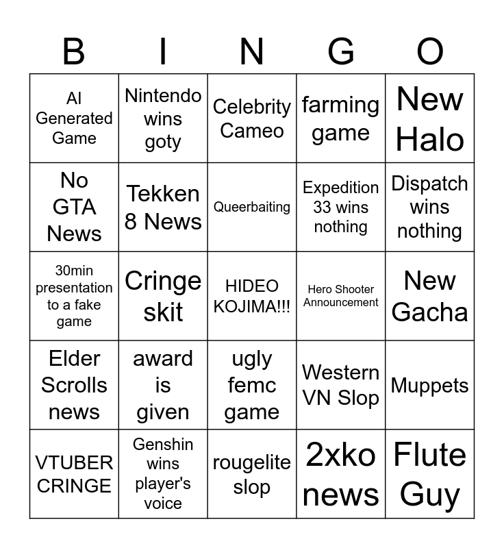 This bingo card has a free space and 24 words: award is given, Genshin wins player's voice, Queerbaiting, VTUBER CRINGE, New Halo, AI Generated Game, No GTA News, Nintendo wins goty, Hero Shooter Announcement, ugly femc game, Expedition 33 wins nothing, 30min presentation to a fake game, Western VN Slop, Muppets, Tekken 8 News, 2xko news, New Gacha, Celebrity Cameo, Dispatch wins nothing, Cringe skit, Flute Guy, Elder Scrolls news, farming game and rougelite slop.