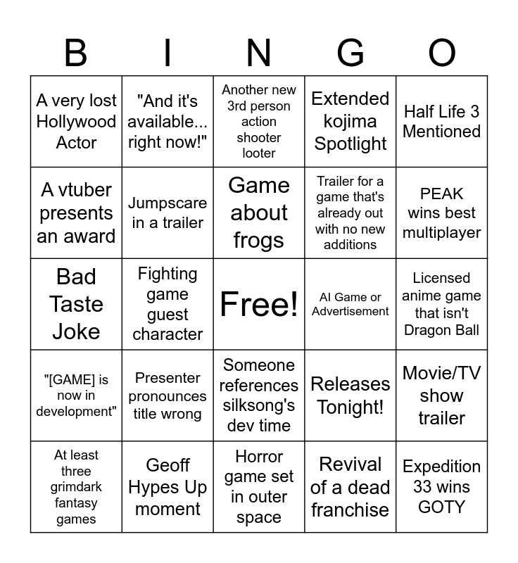 This bingo card has a free space and 24 words: Presenter pronounces title wrong, Geoff Hypes Up moment, Game about frogs, At least three grimdark fantasy games, Half Life 3 Mentioned, A very lost Hollywood Actor, A vtuber presents an award, "And it's available... right now!", AI Game or Advertisement, Someone references silksong's dev time, Trailer for a game that's already out with no new additions, Bad Taste Joke, Releases Tonight!, Movie/TV show trailer, Jumpscare in a trailer, Revival of a dead franchise, Licensed anime game that isn't Dragon Ball, Another new 3rd person action shooter looter, PEAK wins best multiplayer, Fighting game guest character, Expedition 33 wins GOTY, "[GAME] is now in development", Extended kojima Spotlight and Horror game set in outer space.