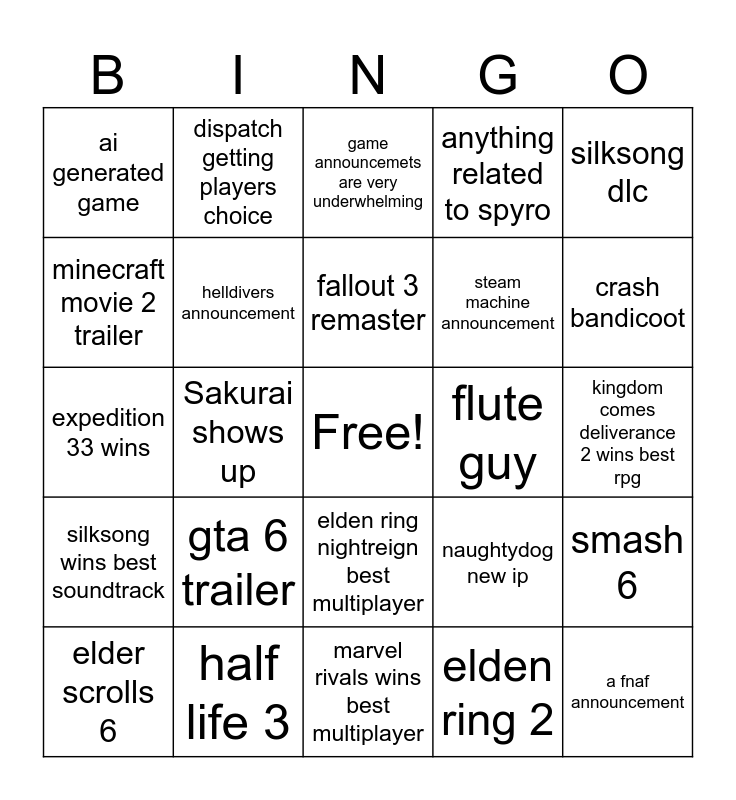 This bingo card has a free space and 24 words: gta 6 trailer, half life 3, fallout 3 remaster, elder scrolls 6, silksong dlc, ai generated game, minecraft movie 2 trailer, dispatch getting players choice, flute guy, elden ring nightreign best multiplayer, steam machine announcement, expedition 33 wins, naughtydog new ip, smash 6, helldivers announcement, elden ring 2, kingdom comes deliverance 2 wins best rpg, game announcemets are very underwhelming, crash bandicoot, Sakurai shows up, a fnaf announcement, silksong wins best soundtrack, anything related to spyro and marvel rivals wins best multiplayer.