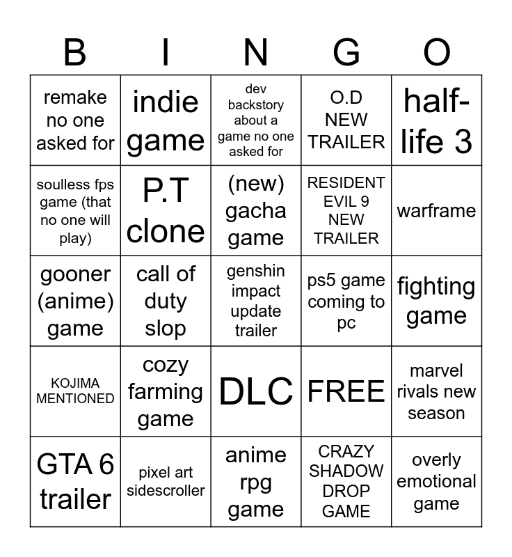 This bingo card has 25 words: cozy farming game, anime rpg game, (new) gacha game, GTA 6 trailer, half-life 3, remake no one asked for, soulless fps game (that no one will play), indie game, ps5 game coming to pc, DLC, RESIDENT EVIL 9 NEW TRAILER, gooner (anime) game, FREE, marvel rivals new season, P.T clone, overly emotional game, fighting game, dev backstory about a game no one asked for, warframe, call of duty slop, genshin impact update trailer, pixel art sidescroller, KOJIMA MENTIONED, O.D NEW TRAILER and CRAZY SHADOW DROP GAME.