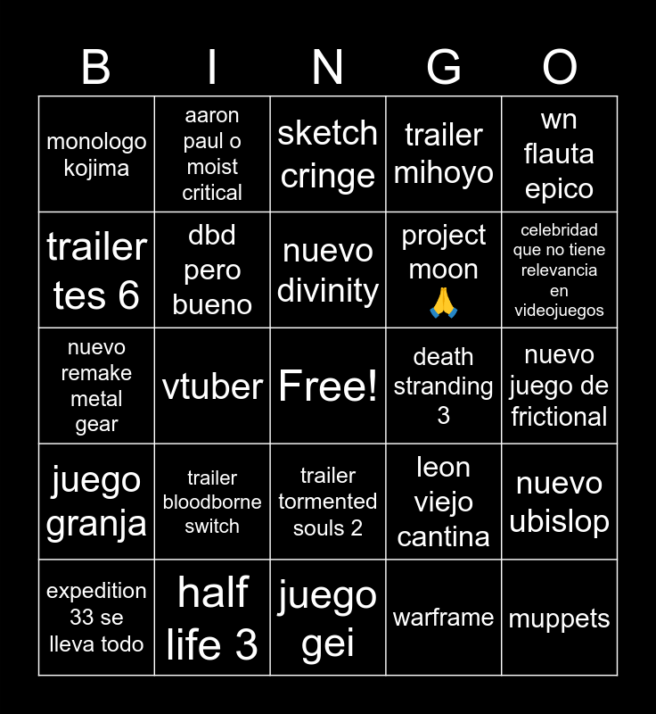 This bingo card has a free space and 24 words: trailer bloodborne switch, half life 3, nuevo divinity, expedition 33 se lleva todo, wn flauta epico, monologo kojima, trailer tes 6, aaron paul o moist critical, death stranding 3, trailer tormented souls 2, project moon 🙏, nuevo remake metal gear, leon viejo cantina, nuevo ubislop, dbd pero bueno, warframe, nuevo juego de frictional, sketch cringe, celebridad que no tiene relevancia en videojuegos, vtuber, muppets, juego granja, trailer mihoyo and juego gei.