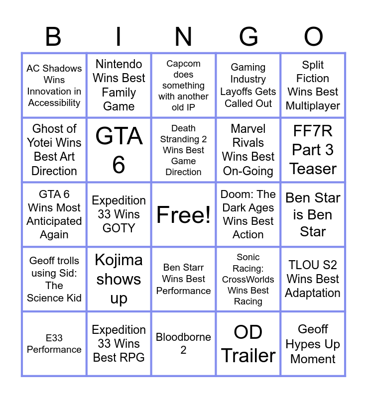 This bingo card has a free space and 24 words: Kojima shows up, Expedition 33 Wins Best RPG, Death Stranding 2 Wins Best Game Direction, E33 Performance, Split Fiction Wins Best Multiplayer, AC Shadows Wins Innovation in Accessibility, Ghost of Yotei Wins Best Art Direction, Nintendo Wins Best Family Game, Doom: The Dark Ages Wins Best Action, Ben Starr Wins Best Performance, Marvel Rivals Wins Best On-Going, GTA 6 Wins Most Anticipated Again, Sonic Racing: CrossWorlds Wins Best Racing, TLOU S2 Wins Best Adaptation, GTA 6, OD Trailer, Ben Star is Ben Star, Capcom does something with another old IP, FF7R Part 3 Teaser, Expedition 33 Wins GOTY, Geoff Hypes Up Moment, Geoff trolls using Sid: The Science Kid, Gaming Industry Layoffs Gets Called Out and Bloodborne 2.