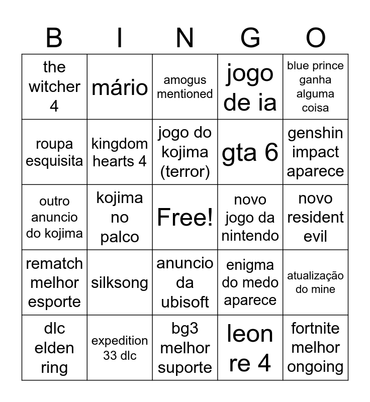 This bingo card has a free space and 24 words: silksong, expedition 33 dlc, jogo do kojima (terror), dlc elden ring, blue prince ganha alguma coisa, the witcher 4, roupa esquisita, mário, novo jogo da nintendo, anuncio da ubisoft, gta 6, outro anuncio do kojima, enigma do medo aparece, atualização do mine, kingdom hearts 4, leon re 4, novo resident evil, amogus mentioned, genshin impact aparece, kojima no palco, fortnite melhor ongoing, rematch melhor esporte, jogo de ia and bg3 melhor suporte.