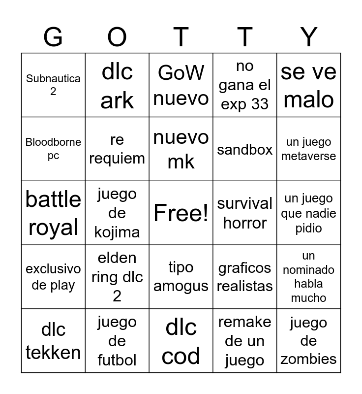 This bingo card has a free space and 24 words: elden ring dlc 2, juego de futbol, nuevo mk, dlc tekken, se ve malo, Subnautica 2, Bloodborne pc, dlc ark, survival horror, tipo amogus, sandbox, battle royal, graficos realistas, un nominado habla mucho, re requiem, remake de un juego, un juego que nadie pidio, GoW nuevo, un juego metaverse, juego de kojima, juego de zombies, exclusivo de play, no gana el exp 33 and dlc cod.