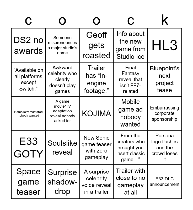 This bingo card has a free space and 24 words: Soulslike reveal, Surprise shadow-drop, Trailer has “In-engine footage.”, Space game teaser, HL3, DS2 no awards, “Available on all platforms except Switch.”, Someone mispronounces a major studio’s name, Mobile game ad nobody wanted, New Sonic game teaser with zero gameplay, Final Fantasy reveal that isn’t FF7-related, Remake/remastered nobody wanted, From the creators who brought you insert classic game…”, Persona logo flashes and the crowd loses it, Awkward celebrity who clearly doesn’t play games, Trailer with close to no gameplay at all, Embarrassing corporate sponsorship, Geoff gets roasted, Bluepoint’s next project tease, A game movie/TV adaptation reveal nobody asked for, E33 DLC announcement, E33 GOTY, Info about the new game from Studio Ico and A surprise celebrity voice reveal in a trailer.