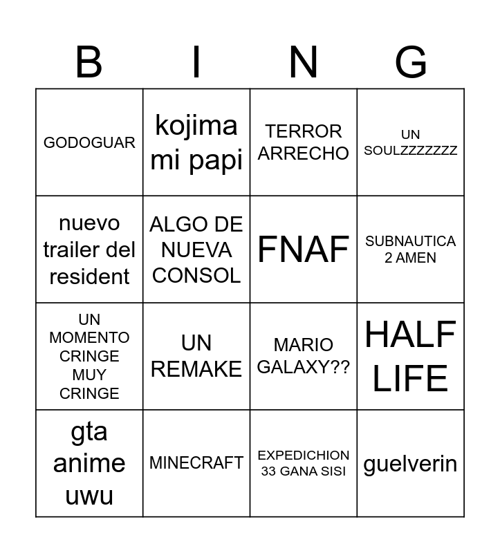 This bingo card has 16 words: MINECRAFT, HALF LIFE, TERROR ARRECHO, GODOGUAR, UN MOMENTO CRINGE MUY CRINGE, kojima mi papi, MARIO GALAXY??, EXPEDICHION 33 GANA SISI, nuevo trailer del resident, ALGO DE NUEVA CONSOL, gta anime uwu, UN SOULZZZZZZZ, UN REMAKE, SUBNAUTICA 2 AMEN, FNAF and guelverin.