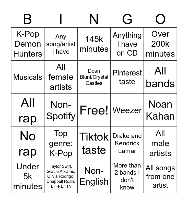 This bingo card has a free space and 24 words: Top genre: K-Pop, Taylor Swift, Gracie Abrams, Olivia Rodrigo, Chappell Roan, Billie Eilish, Dean Blunt/Crystal Castles, Under 5k minutes, Over 200k minutes, K-Pop Demon Hunters, Musicals, Any song/artist I have, Weezer, Tiktok taste, Pinterest taste, All rap, Drake and Kendrick Lamar, All male artists, All female artists, More than 2 bands I don't know, Noan Kahan, 145k minutes, All bands, Non-Spotify, All songs from one artist, No rap, Anything I have on CD and Non-English.