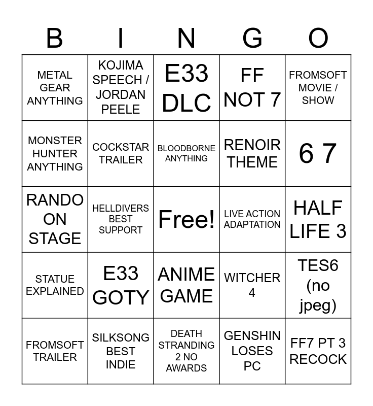 This bingo card has a free space and 24 words: E33 GOTY, SILKSONG BEST INDIE, BLOODBORNE ANYTHING, FROMSOFT TRAILER, FROMSOFT MOVIE / SHOW, METAL GEAR ANYTHING, MONSTER HUNTER ANYTHING, KOJIMA SPEECH / JORDAN PEELE, LIVE ACTION ADAPTATION, ANIME GAME, RENOIR THEME, RANDO ON STAGE, WITCHER 4, TES6 (no jpeg), COCKSTAR TRAILER, GENSHIN LOSES PC, HALF LIFE 3, E33 DLC, 6 7, HELLDIVERS BEST SUPPORT, FF7 PT 3 RECOCK, STATUE EXPLAINED, FF NOT 7 and DEATH STRANDING 2 NO AWARDS.