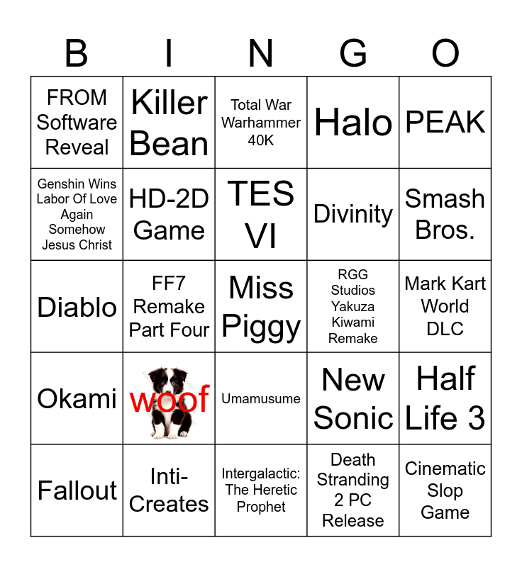 This bingo card has 1 images, a free space and 24 words: woof, Inti-Creates, TES VI, Fallout, PEAK, FROM Software Reveal, Genshin Wins Labor Of Love Again Somehow Jesus Christ, Killer Bean, RGG Studios Yakuza Kiwami Remake, Umamusume, Divinity, Diablo, New Sonic, Half Life 3, HD-2D Game, Death Stranding 2 PC Release, Mark Kart World DLC, Total War Warhammer 40K, Smash Bros., FF7 Remake Part Four, Cinematic Slop Game, Okami, Halo and Intergalactic: The Heretic Prophet.