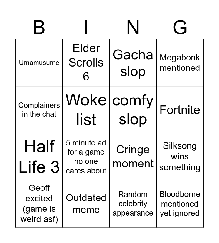 This bingo card has 16 words: Outdated meme, Silksong wins something, Gacha slop, Umamusume, Half Life 3, Elder Scrolls 6, Cringe moment, Random celebrity appearance, Complainers in the chat, Woke list, Geoff excited (game is weird asf), Megabonk mentioned, 5 minute ad for a game no one cares about, Fortnite, comfy slop and Bloodborne mentioned yet ignored.